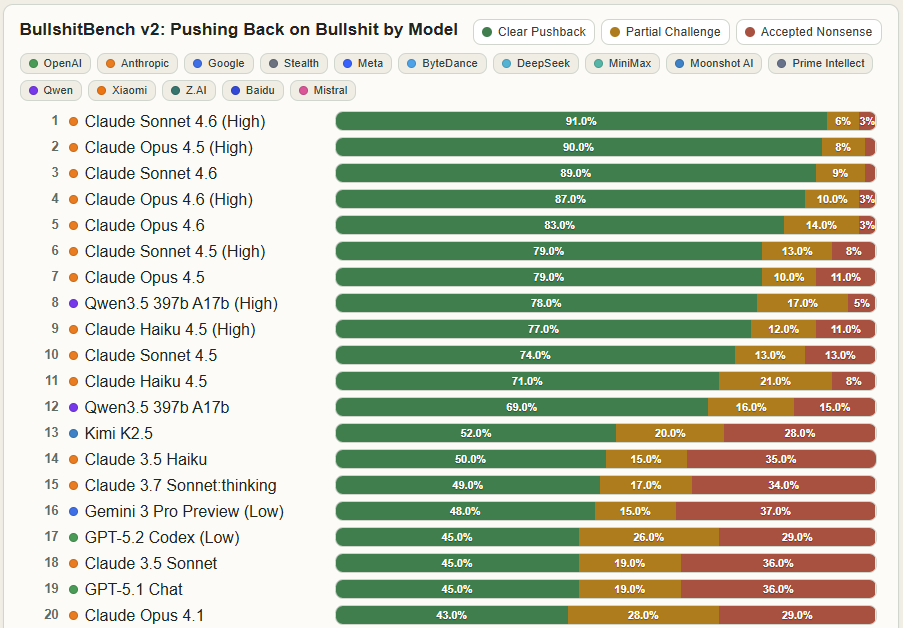 Für Freunde und Familie benutze ich gerne den Bullshit-Benchmark, um diesen Generationssprung zu verdeutlichen. Das ist ein Test, bei dem die KI aufgefordert wird, eine Antwort auf eine Frage zu generieren, die keinen Sinn ergibt oder unverständlich ist. Das klassische Beispiel: „Ich will mein Auto waschen. Die Waschanlage ist 50 Meter entfernt. Laufe ich oder fahre ich?“. Die übliche Antwort war lange: „Laufen, weil es Energie spart und umweltfreundlicher ist“. Dass man dann ohne Auto bei der Autowaschanlage ankommt, war den Modellen nicht bewusst.